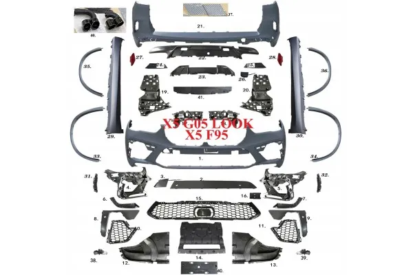 Kit de carrocería para BMW X5 G05 compatible con BMW X5M F95 antes del restyling. El conjunto completo incluye todas las piezas visibles en la foto.